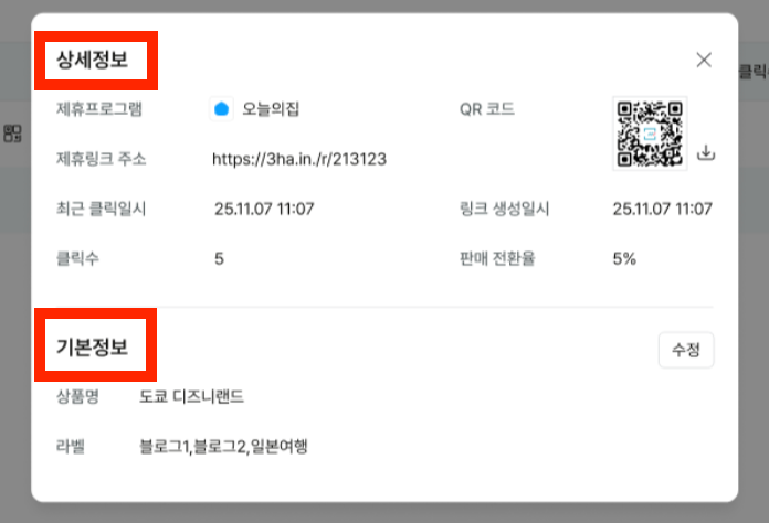 생성한 제휴링크의 상세 정보를 한눈에 확인 가능
